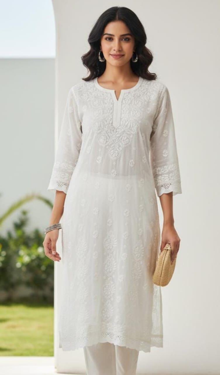 Trivia: The chikankari work was initially done on white yarn known as tanzeb. Though embroidery has evolved with time it still remains delicate, intricate and graceful. The chikan garment goes through the production process anywhere between one to six months. The fabric is cut in the desired shape, followed by pre-embroidery work to get the desired shape of the embroidery. After printing the design on the semi-stitched garment the embroidery is begun. This is followed by a quality check. The garment is washed in a bhatti, dried and finished! There are in all 36 stitching techniques involved in Chikankari.